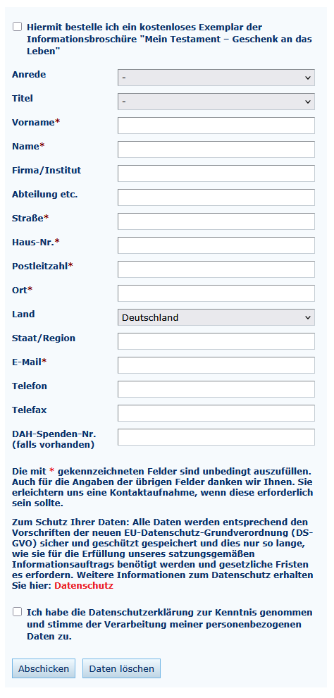 Auf vielfachen Wunsch haben wir in einer anschaulichen Testamentsbroschüre zahlreiche nützliche und leicht verständliche Hinweise zu diesem äußerst persönlichen Thema zusammengetragen. Sie finden darin wichtige Informationen zum Thema Erbrecht – wie zum Beispiel welche Testamentsformen es gibt, was beim Abfassen zu beachten ist und wo ein Testament aufbewahrt werden sollte. Zusätzlich wird darüber informiert, wie Sie Änderungen vornehmen können, was eine fachkundige Beratung kostet und was Sie über die Erbschaftsteuer wissen sollten. Das 48-seitige Informationsheft können Sie kostenlos mit nachfolgendem Formular bestellen: